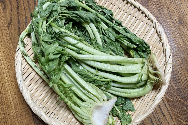 1./大根の葉は根元を半分に割り、1日程度陽に干してしんなりさせる。