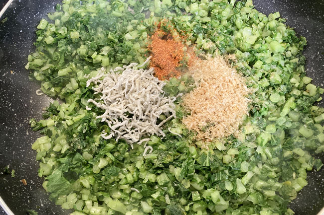 4./3にちりめんじゃこ、鰹節、一味唐辛子を入れて軽く炒め、醤油、日本酒を回しかけて水気がなくなるまで炒める。