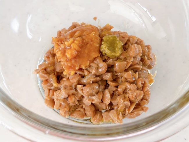 1./納豆は、包丁でたたいて細かく刻む(ひきわり納豆を使う場合はそのまま)。細かく刻んだ納豆をボウルに入れ、味噌、オリーブオイル、柚子胡椒(お好みで)を全て加えて粘りがでるまでよく混ぜ合わせる。