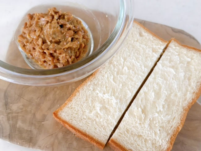 2./食パンは、半分に切っておき、1の納豆をまんべんなく塗る。