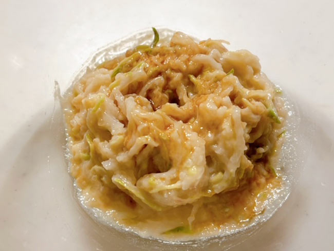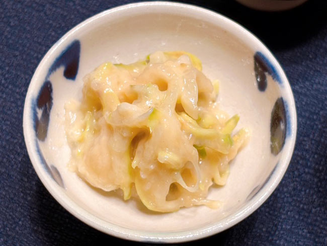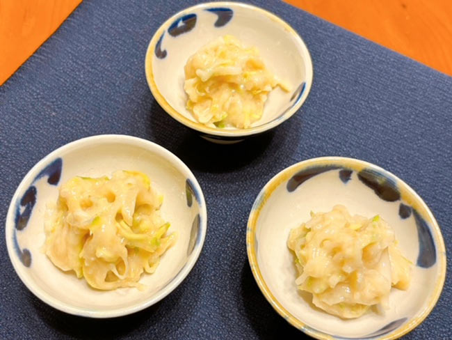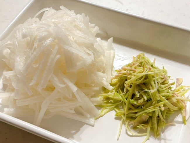 3./わさびは、皮の表面の黒くなっているところを取り除いて薄く切り、さらに千切りにする。大根も同じように薄く千切りにする。それぞれ、適量の塩をふって混ぜ合わせ5分ほどおき、水気が出てきたら固く絞る。大根は好みでさいの目などにしてもいい。