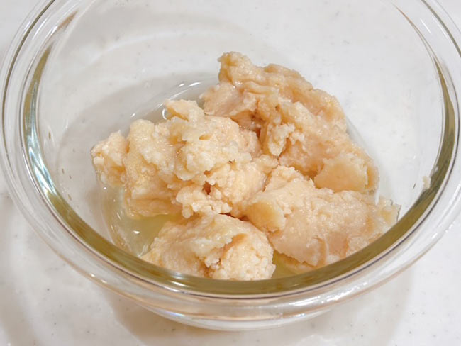 1./耐熱ボウルに酒粕、本味醂、日本酒を入れてラップをして電子レンジで加熱する。目安の時間は、600wで30秒ほど。