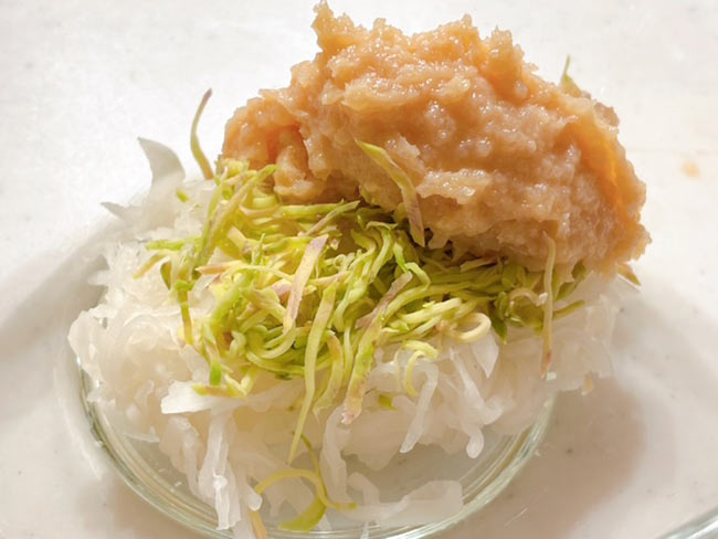 4./千切りにして水分をしっかり絞った大根とわさびに2で作った酒粕ペーストを加えて、全体を混ぜる。