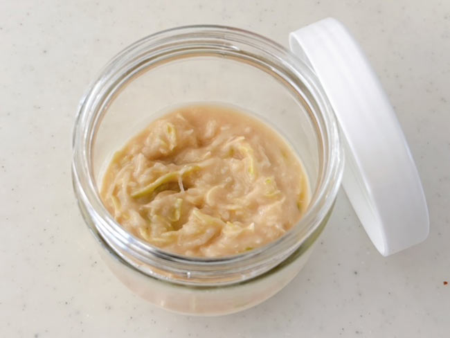 2./加熱した1をしっかりと練るように混ぜ合わせる。冷めたら味をみて、薄口醤油を加えてさらに混ぜ合わせペーストにする。甘味は最後にお好みではちみつ小さじ1程度を加えて調整する。