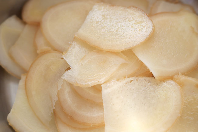 1./しょうがは洗って皮の汚い部分を切り取り、皮ごと薄切りにする。