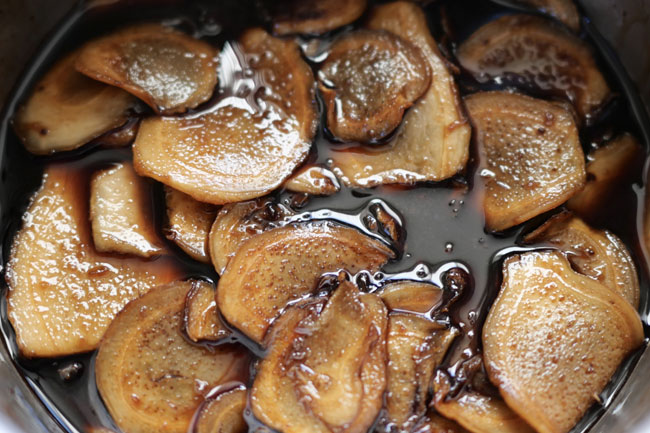 3./水分が出て全体に黒糖が溶けてきたら火にかける。煮立ち始めたら弱火にして、ふたをして時々混ぜながら20分煮る。火を止めてシナモンパウダーをふり入れて出来上がり。