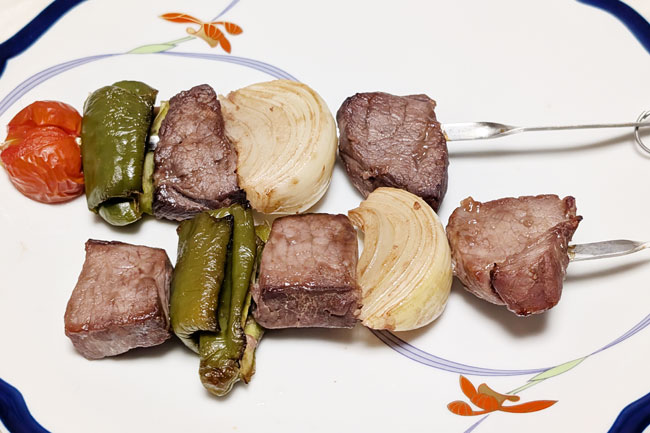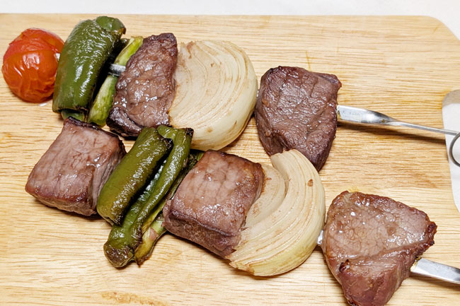 フランス語では「ブロシェット」。調味液に浸けた肉やシーフードを焼くのが定番です。今回は牛肉で作りました。塩麹を使って肉を柔らかくし旨味もアップ。