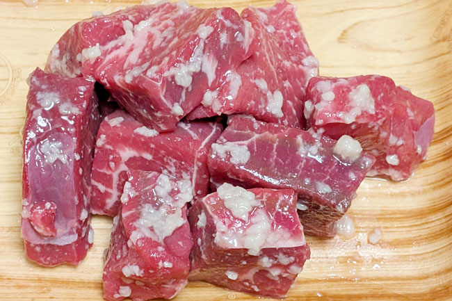 1./牛肉を大き目のひと口大に切る。カレーシチュー用ならそのままでよい。全体に塩麹をもみ込み、10分ほど置いておく。