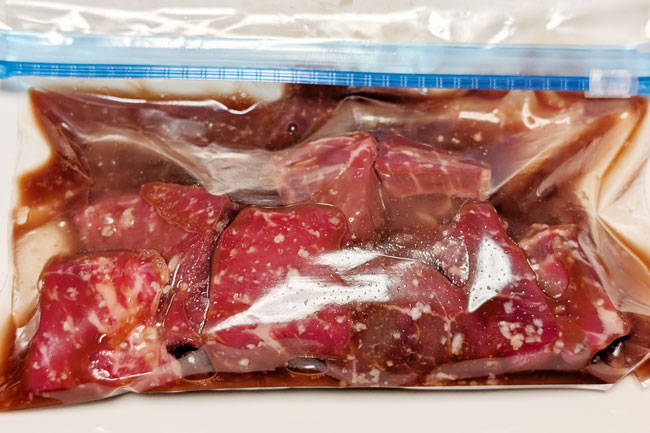 3./2の袋に1の牛肉を入れ、できるだけ空気を抜いて閉じる。肉に2の調味液が浸かるようにする>