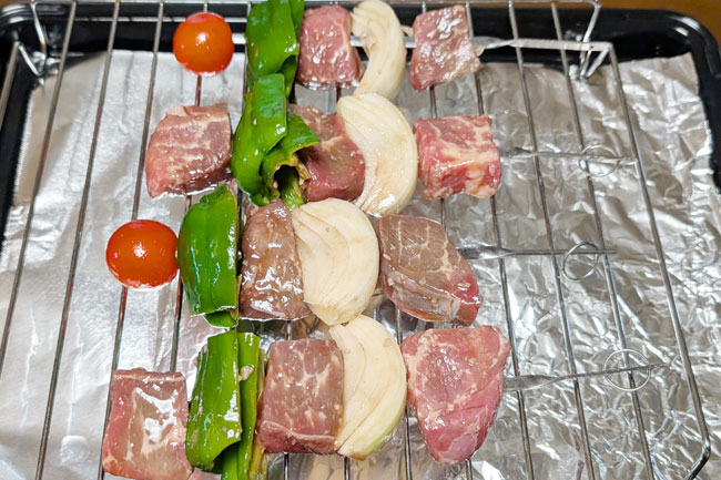 7./オーブン皿にアルミホイルを敷く。その上にグリル用調理網をセットする。調理網に薄くサラダ油を塗る。牛肉と野菜を彩りよく串に刺し、調理網にのせる。