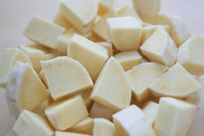 1./さつまいもは皮をむいて角切りにしてみりんとともに耐熱容器に入れる。ふんわりラップをかけて電子レンジで7〜8分加熱する。