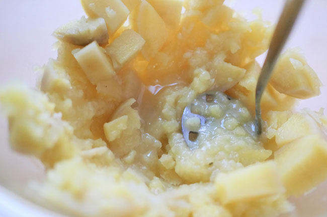 2./さつまいもに火が通ったら、マッシャーなどでよくつぶす。卵黄を加えてなめらかに混ぜる。