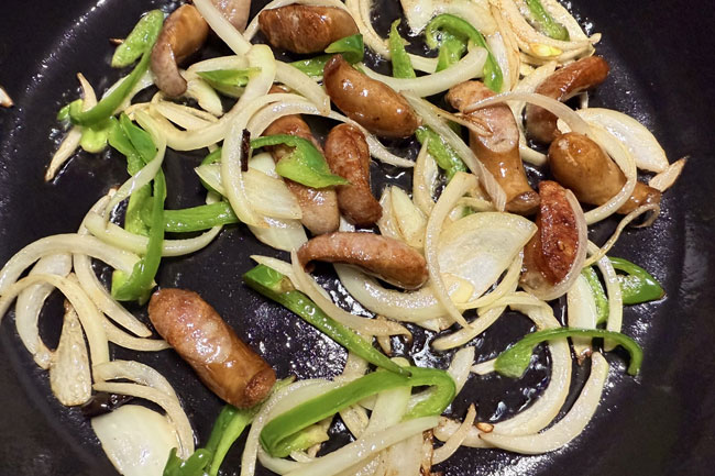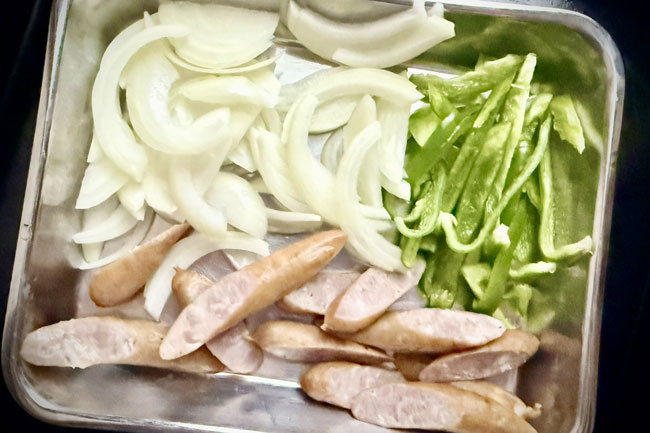 1./ソーセージを斜め切り、ピーマンと玉ねぎは5~6mmほどの細切りにする。