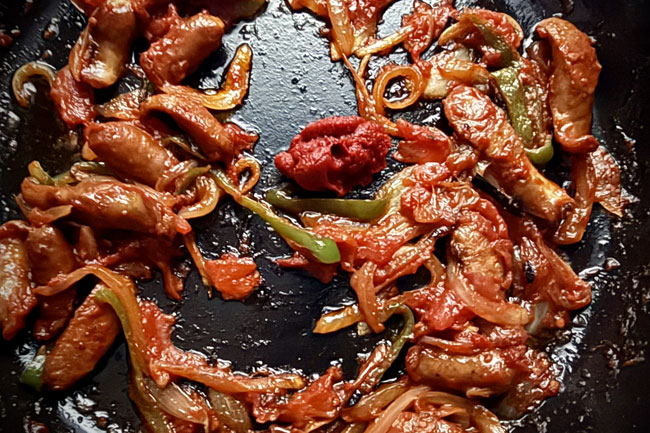 6./水分がとんだら、濃縮トマト(無ければトマトケチャップ)を入れさらに数分煮つめる。