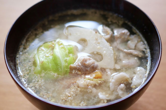 豚肉、野菜は食べやすい大きさに切り、れんこんは水にさらします。ごま油でまず豚肉を炒め、根菜類もさっと炒めます。だし汁とともに鍋に入れ、火にかけます。煮立ってきたらあくを取り、れんこんに火が通るまで煮ます。キャベツも加えてみそを溶き入れ、最後にすりごまを散らして出来上がり。