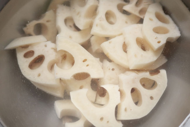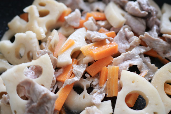 2./フライパンにごま油を熱し、豚肉を炒める。全体に色が変わってきたら、れんこん、にんじんも加えてさっと炒める。