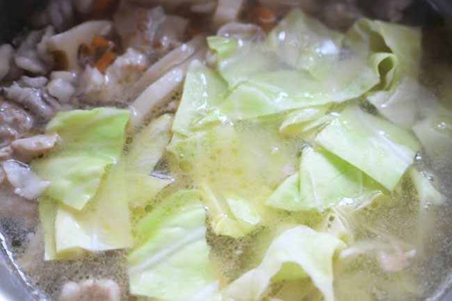 4./キャベツを加えてひと煮立ちしたら、みそを溶き入れ最後にすりごまを散らして出来上がり。