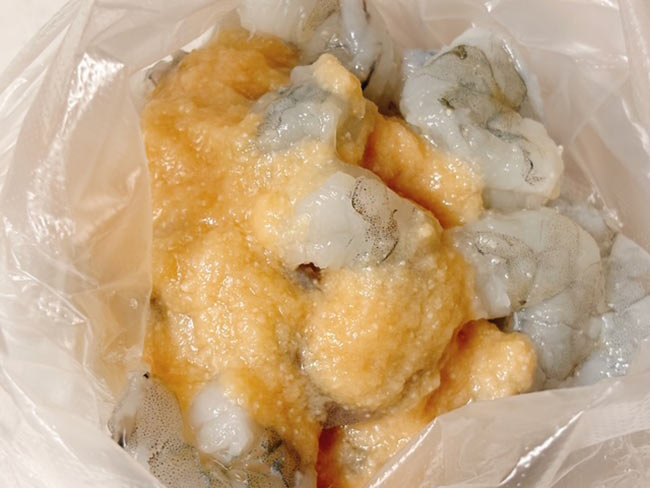 2./保存袋に1のむきえびを入れて、塩麹を加えて揉みこみ1時間以上漬けておく。