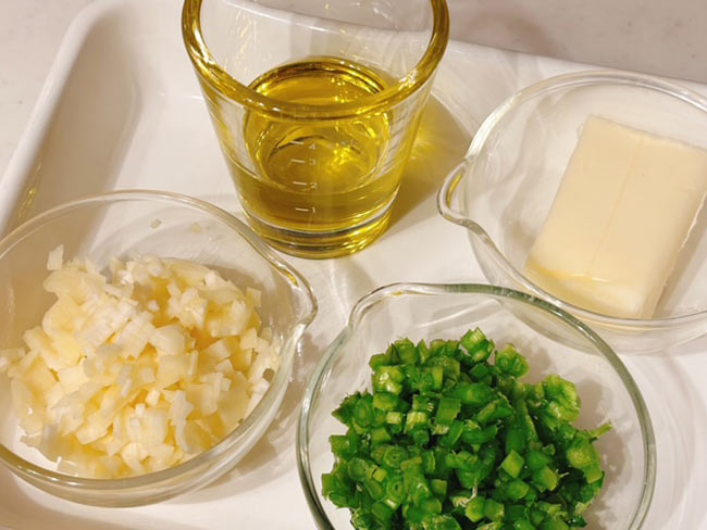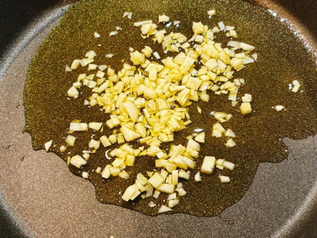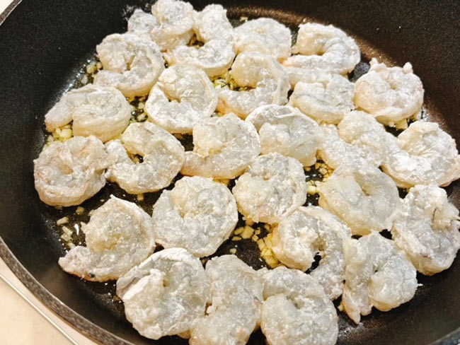 5./フライパンにオリーブオイルとにんにくのみじん切りを加えて炒める。にんにくの香りが立ってきたら、4のむきえびを並び入れる。