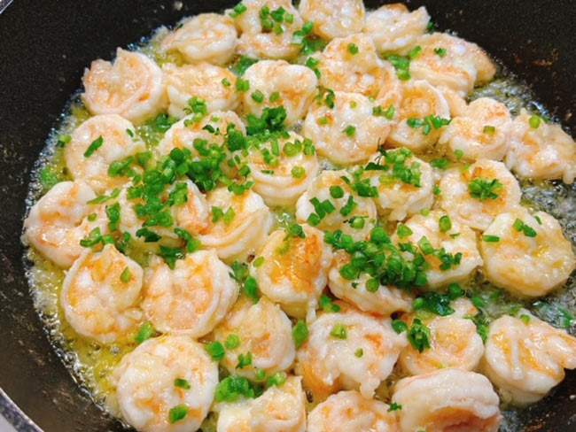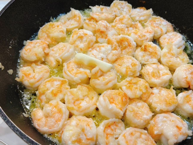 7./むきえび全体に火が通ってきたらバターを加えて、焼き目が少しつくように焼き上げる。