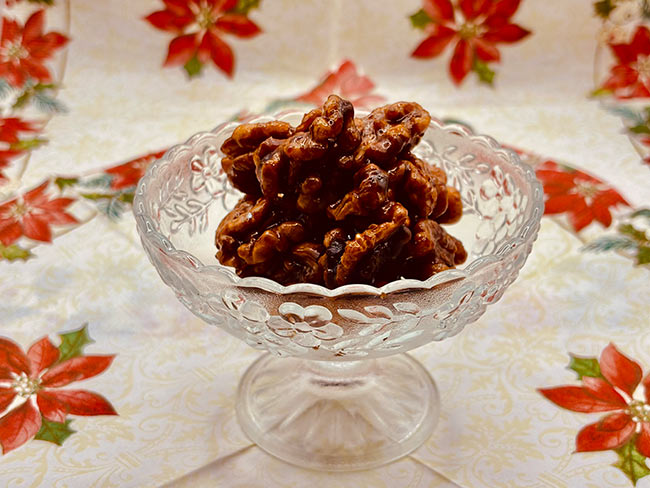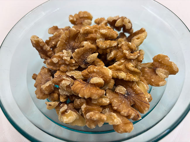 くるみはナッツの中でも日本に昔からある身近なものですが、最近よく耳にする「オメガ3脂肪酸」が多く含まれ、生活習慣病の予防にもなるといいます。和食ではくるみ和え・くるみ豆腐・蕎麦のつけ汁などにも使われ、ほかにはサラダやパンの具材などにもよく登場します。今回は食べやすく黒糖を絡ませお茶うけにしてみました。