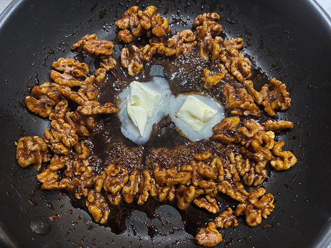 3./溶けた黒糖水をローストしたフライパンのくるみに加えて、全体に馴染んだらハチミツを流し入れる。この時、火力は中火弱のままですが、焦げそうなら火を弱める。