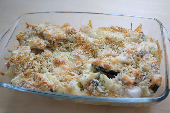 ひと口大に切った鮭とかぶにチーズとパン粉をたっぷりかけて焼くだけのオーブン料理です。かぶの甘みや鮭の旨味をオーブンの熱がじっくり引き出してくれ、カリカリに焼けたチーズとパン粉との相性も抜群です。ドライパセリの代わりにお好みハーブでもいいでしょう。