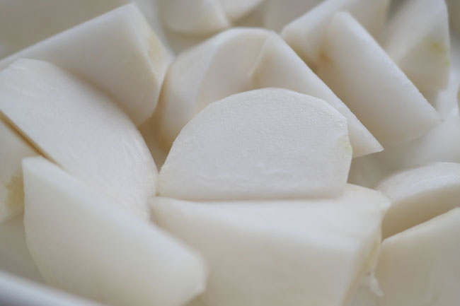 2./かぶは皮をむいて8つに切る。