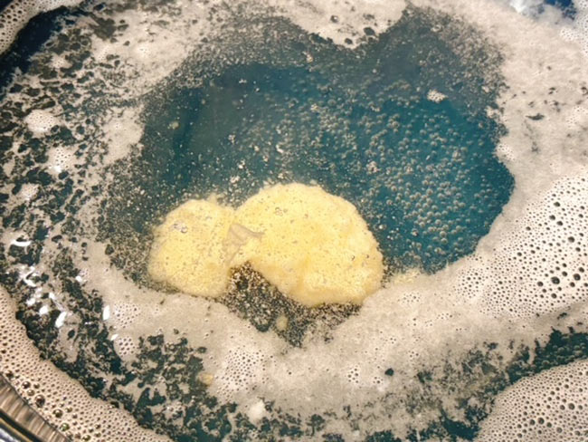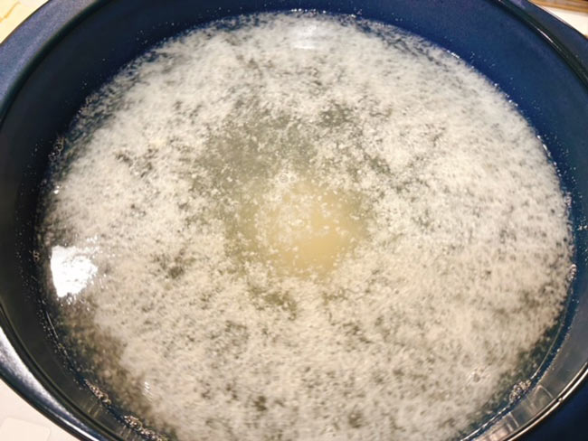 4./水出しをした昆布を入れたお鍋を火にかける。日本酒も加える。鍋が沸いてきたら、ペーストにしておいた酒粕を加えて全体をよく混ぜる。昆布は、ひきあげておく。