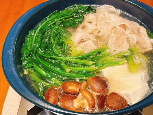 5./食卓で軽く沸いた状態を保ちながら、最初は、椎茸と豆腐を入れて軽く火が通ったら、食べたい分量のほうれん草や豚しゃぶ肉を鍋に入れて火を通す。