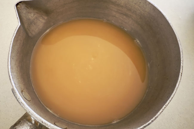 2./鍋に、出汁、淡口醤油、みりん、塩を入れ、火にかけ、ひと煮立ちしたら火を止める。粗熱が取れたら水辛子を入れ、よく混ぜる。