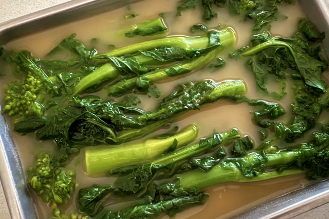 3./平たい容器に、1の菜の花を並べ、2を茶こしを使ってそそぎ、菜の花全体が汁に浸るようにする。
