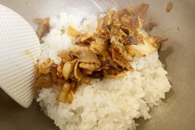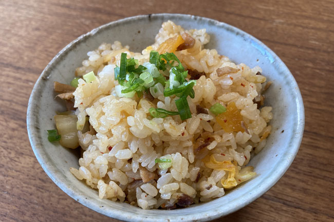 キムチとタクアンは粗みじんにし、食感を残します。豚肉はバラ肉でも小間肉でもお好みでどうぞ。具材のみ多めに作っておくこともできるので、いつでも白ごはんと混ぜていただけます。