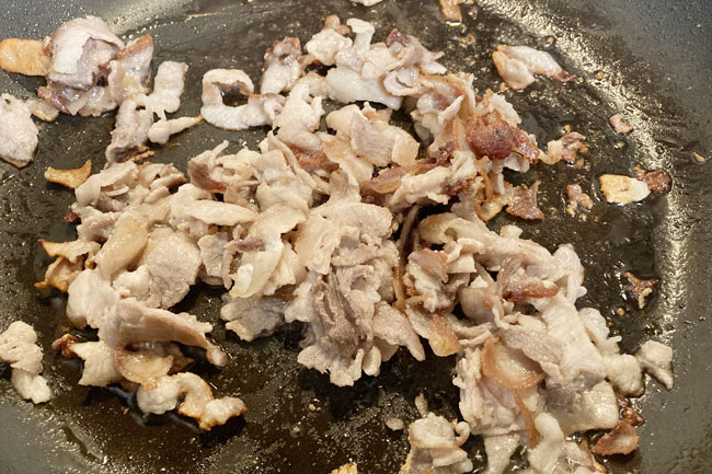 2./フライパンにごま油を引き、1の豚肉を入れて焼き色がつくまで炒める。