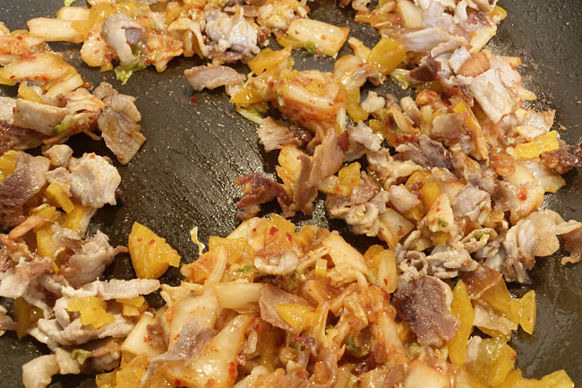 1./豚肉を幅1cmぐらいにザクザクと切る。キムチとタクアンは粗みじんに切っておく。