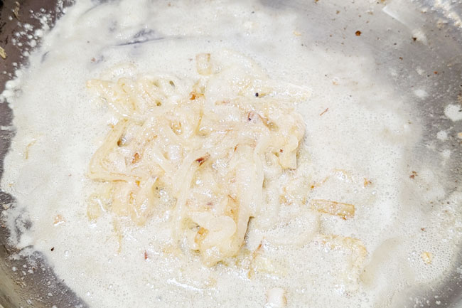 4./タマネギがしんなりして透明になったら、バターと小麦粉を入れて炒める。粉気がなくなるまで、タマネギにからめてよく炒める。