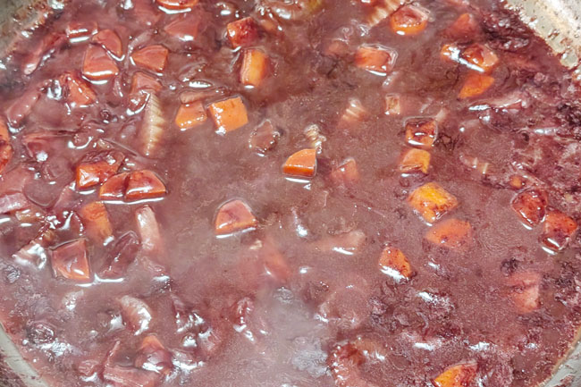 5./3のニンジンとセロリを戻し入れる。赤ワインを入れて、中火にし、沸騰したら5分ほど沸騰状態を保ってアルコールをとばす。