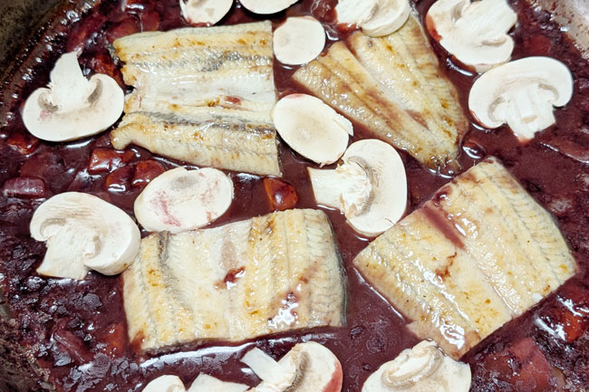 7./横4つに切ったウナギの白焼きと、薄切りしたマッシュルームを加える。蓋をして15分ほど煮込む。途中で、身をくずさないように注意しながら、ウナギの上下をひっくり返す。