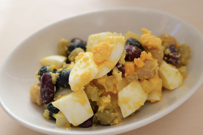 3./ゆで卵の殻を剥いて粗みじんにしてボウルに入れ、2、ミックスビーンズ、塩麹、オリーブオイル、レモン汁、こしょうも加え、よく混ぜて出来上がり。