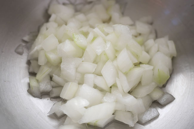2./玉ねぎは粗みじんにして耐熱容器に入れ、ラップをふんわりかけて電子レンジで1分加熱する。透けてきたら、ラップを外して粗熱を取る。