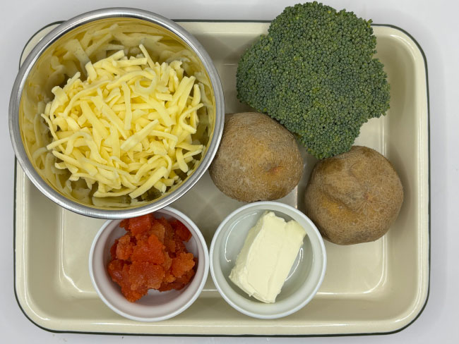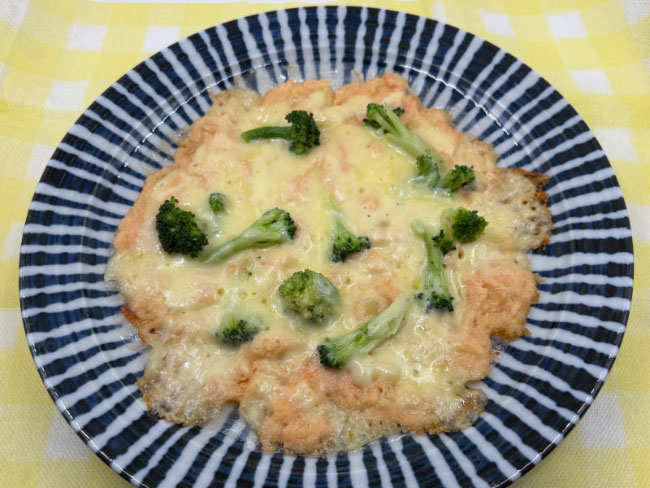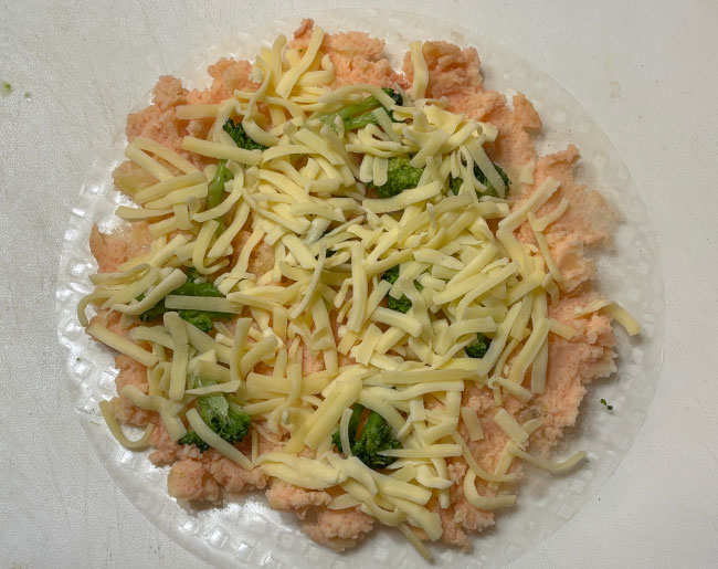 7./ライスペーパーの上に6を塗り広げ、ブロッコリーとピザ用チーズをのせる。
