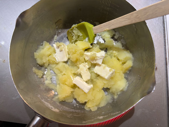 4./ジャガイモが茹だったらお湯をこぼして、鍋の中でジャガイモをつぶす。