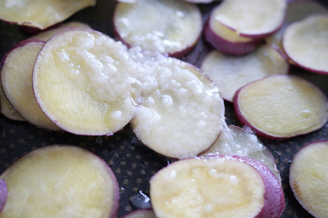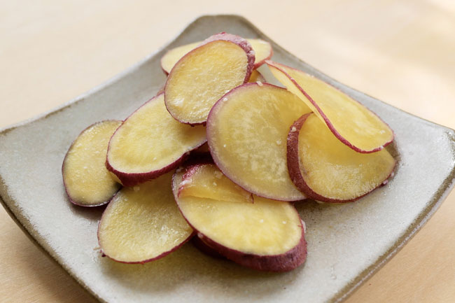 さつまいもをシンプルに楽しむ一品です。ほんの少しの塩麹で調味して、レモンではなく柚子を使って香りづけします。ホクホクでもねっとりでもなく薄切り食感で、さつまいもの甘みをじっくり味わえます。