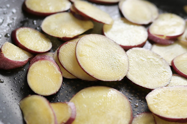 さつまいもは斜め薄切りにして水にさらし、電子レンジで加熱します。フライパンで油を熱し、さつまいもを炒め、塩麹で調味します。火を止めて柚子の絞り汁も加えて出来上がり。さつまいもは歯ごたえを残したいので、加熱し過ぎないようにします。