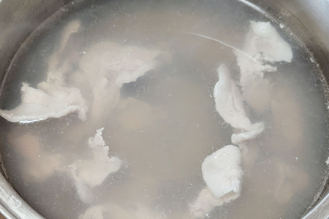 4./2の昆布水が沸騰する直前に昆布を取り出し、顆粒だしを入れる。豚肉をほぐし入れて中火にする。
