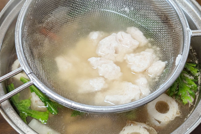 6./具材に火が通ったら、1の酒粕を網じゃくしでこしながら、溶かし入れる。