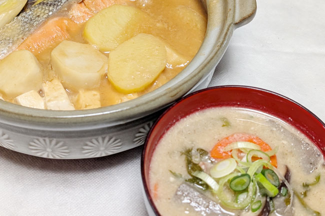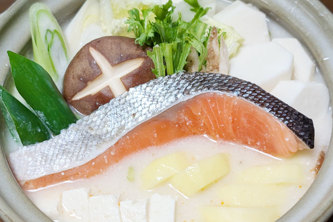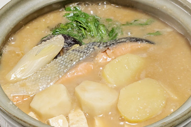 京都の実家では、みそ味の酒粕汁にはたっぷりの鮭のアラとイモ類がお約束でした。その他の具材は、白菜やネギなどの野菜、キノコ類、豆腐など。ひと言でいうなら、いつもの海鮮鍋にイモ類をたっぷり入れることでしょうか。