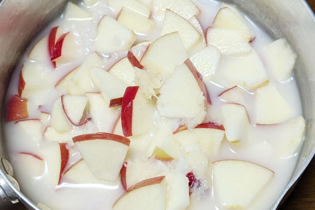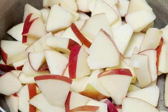 2./リンゴをよく洗い、タテ4つに切って種を切り落とし、皮付きのままイチョウ切りにする。切ったリンゴは1の小鍋に入れていく。全部切り終わったら、レモン汁が全体に行き渡るように軽く混ぜる。