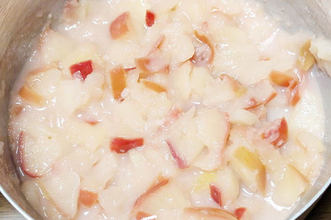 リンゴの品種は、赤い皮で果肉のしっかりしている紅玉がおすすめです。やわらかくなり過ぎず、きれいなピンク色に仕上がります。甘酒の量は厳密でなくてかまいませんが、水分をしっかりとばしてください。