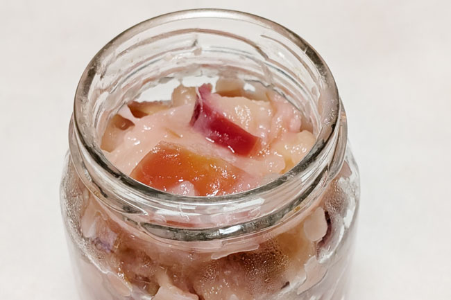 6./きれいなピンク色になり、水分がほぼ完全になくなったら、火を止める。あら熱が取れたら、アルコール消毒をした保存瓶に入れる。